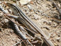 The Gila Spotted Whiptail's distinct stripes (particularly on the neck) and relatively spare spotting distinguish it from the similar looking Chihuahuan Spotted Whiptail. It differs from the Sonoran Spotted Whiptail in having the light spots in the dark dorsal fields that touch or lie within the longitudinal light stripes. The Giant Spotted Whiptail is much larger, has more than 95 granular scales around the mid-body and stripes that tend to disappear with age. |