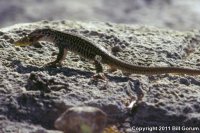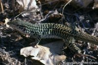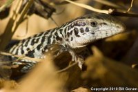Slender lizard with a comparatively long tail, about 3 times the head-body length. Small dorsal scales and eight rows of large, rectangular scales on the belly. Dorsal ground color and pattern vary widely; typically, the pattern is black spots or bars arranged in a checkered manner on a light ground color and there may be six light stripes. Forelimbs are light with dark spots and hind limbs are dark with light spots. Ventral surface is light with possible dark flecks on chin and chest. Yellow or light brown tail with spots on sides. |