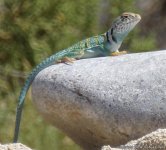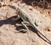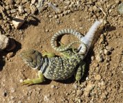 Fairly large, reaching 4.5" SVL and up to 14" TL. The head is large, the tail is long, the back legs are much longer than the front legs. Two black collars are around the neck. Ground color varies among populations with the small granular dorsal scales exhibiting tan, bright green, olive, brown, bluish or yellowish with many light spots and dark crossbands. The belly is whitish. Males are larger than females, their heads are more muscular and are usually more colorful. Color varies from light to bright green, turquoise, or cobalt blue (especially the tail) and, during the breeding season, individuals may develop a yellow head and yellow "socks" around the forelimbs. Females develop orange or rust spots or bars on the sides of the body and neck, which may indicate it is gravid, these fade after eggs are laid. Young males may develop this coloration as well. Darker individuals have been found in lava flows. |