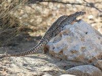 It is usually encountered during the day in the partial shade of low shrubs and bushes. At top speeds it lifts the forelimbs off the ground and runs on its hind limbs. It does not hesitate to bite when captured and it can easily draw blood with its powerful jaws. It may also hiss or squeak when captured. Unlike many of our lizards it can not cast off and regenerate its tail.