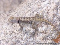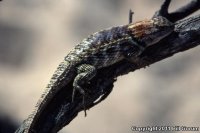 This diurnal lizard basks on the branches of trees, on rocks, or on other sunlit perches. When encountered it is often heard before it is seen as it scratches and claws the bark en route to the opposite side of the trunk or branch. It flees down into the inner tangles of pack rat nests, rock crevices, or burrows when threatened. It has a strong jaw and often bites when captured. |