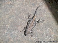 A small (up to 59 mm or 2.3" from snout to vent), slim, gray, gray-brown, or tan lizard with an ornate pattern of thin, dark lines on top of the head. Body markings are variable but usually consist of black or dark gray-brown, irregularly shaped blotches. Some specimens have lengthwise striations and some are plain. On the back are two parallel, lengthwise strips of enlarged, keeled scales separated at the mid-dorsum by a strip of small granular scales. The remainder of the dorsal scales are small and granular. The scales on the tail and limbs are enlarged and keeled. The scales on the belly are smooth and flat. A fold of skin runs along each lower side of the body. Males have two large, blue patches on the belly and a blue, blue-green, green, yellow, or orange throat. In females belly patches are lacking and the throat is yellow, yellow-green, or orange. |