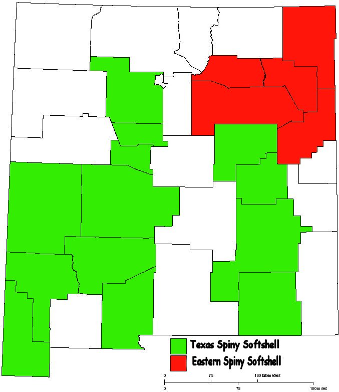 Texas Spiny Softshell Apalone spinifera emoryi Juvenile pattern of white dots confined to rear 1/3 of carapace. Pale border conspicously widened, 4-5 times wider at rear than at sides. Pattern on head and limbs reduced.